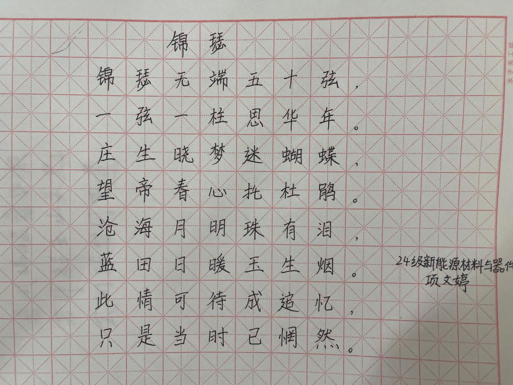 自活动筹备起,公司便借助线上线下多渠道进行广泛宣传,鼓励员工围绕经典诗词、名言警句等主题,自由创作硬笔书法作品,成功点燃了同学们的参与热情,大家都踊跃报名,精心创作参赛作品。在作品征集阶段,公司收到了来自不同专业的大量优秀作品。同学们利用课余时间,精心构思、反复打磨,将对汉字的热爱融入笔尖。有的作品以工整秀丽的楷书抄写《爱国颂》,以苍劲有力的笔触,将对祖国的热爱与赞美之情倾注于每一个字符,刚劲的笔画仿佛诉说着中华儿女的赤子之心;有的作品以娟秀细腻的字体书写《木兰词》,勾勒出花木兰替父从军的巾帼风采,笔锋婉转间尽显柔美与坚毅;还有的以潇洒灵动的行书书写励志名句,笔势如行云流水。评委老师们从笔法、结构、整体布局以及作品的创意等多个角度进行认真评审。经过激烈的角逐,最终评选出各个项目的一、二、三等奖。