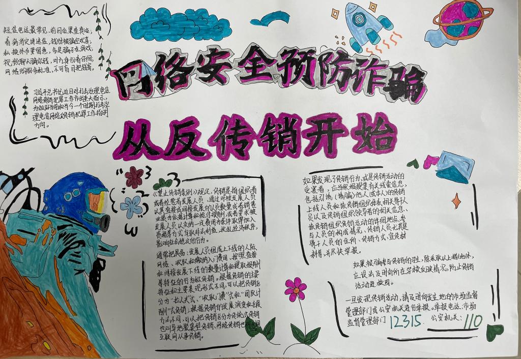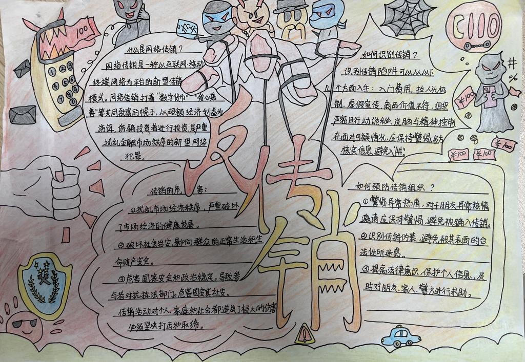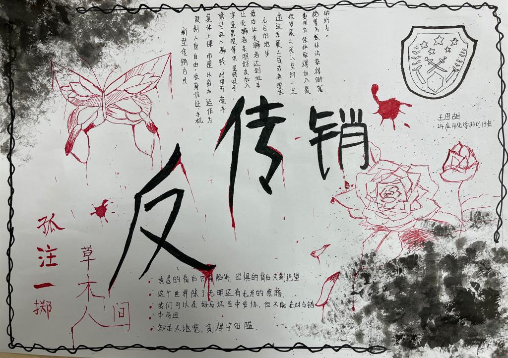 加强宣传教育,开展专题宣传。通过QQ 群,持续推送禁止传销宣传资料级宣传视频,并结合实际开展反诈手抄报宣传教育活动,同学们的手抄报作品内容丰富多彩、有声有色,既能展示当代老员工的多才多艺,又能将反诈知识潜移默化的深入人心。同时积极引导员工自我教育、自我管理、自我服务,将抵御传销融入校园文化,引导员工知法、懂法、守法,营造防范传销的浓厚氛围。