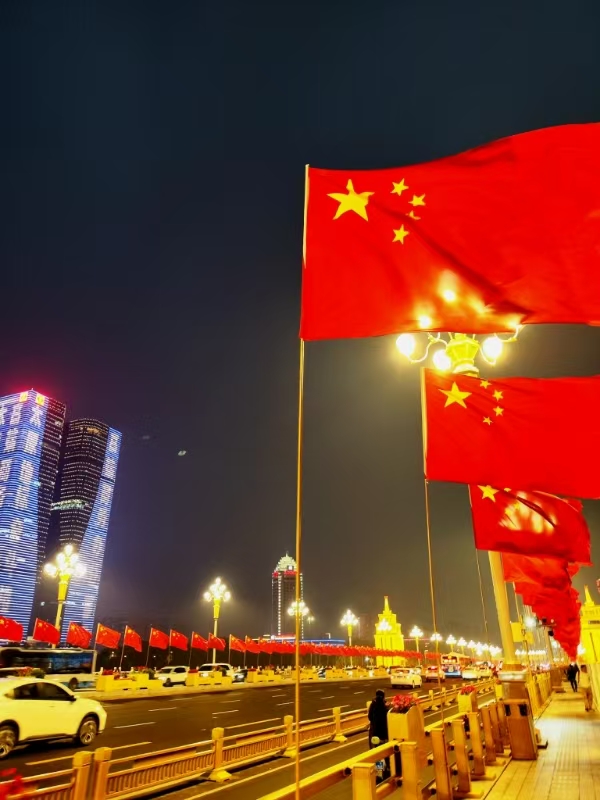 夜幕下,国旗与都市霓虹共舞,将国家的温度织进城市的脉动里(2025级 化学工程与工艺 常佳璐)