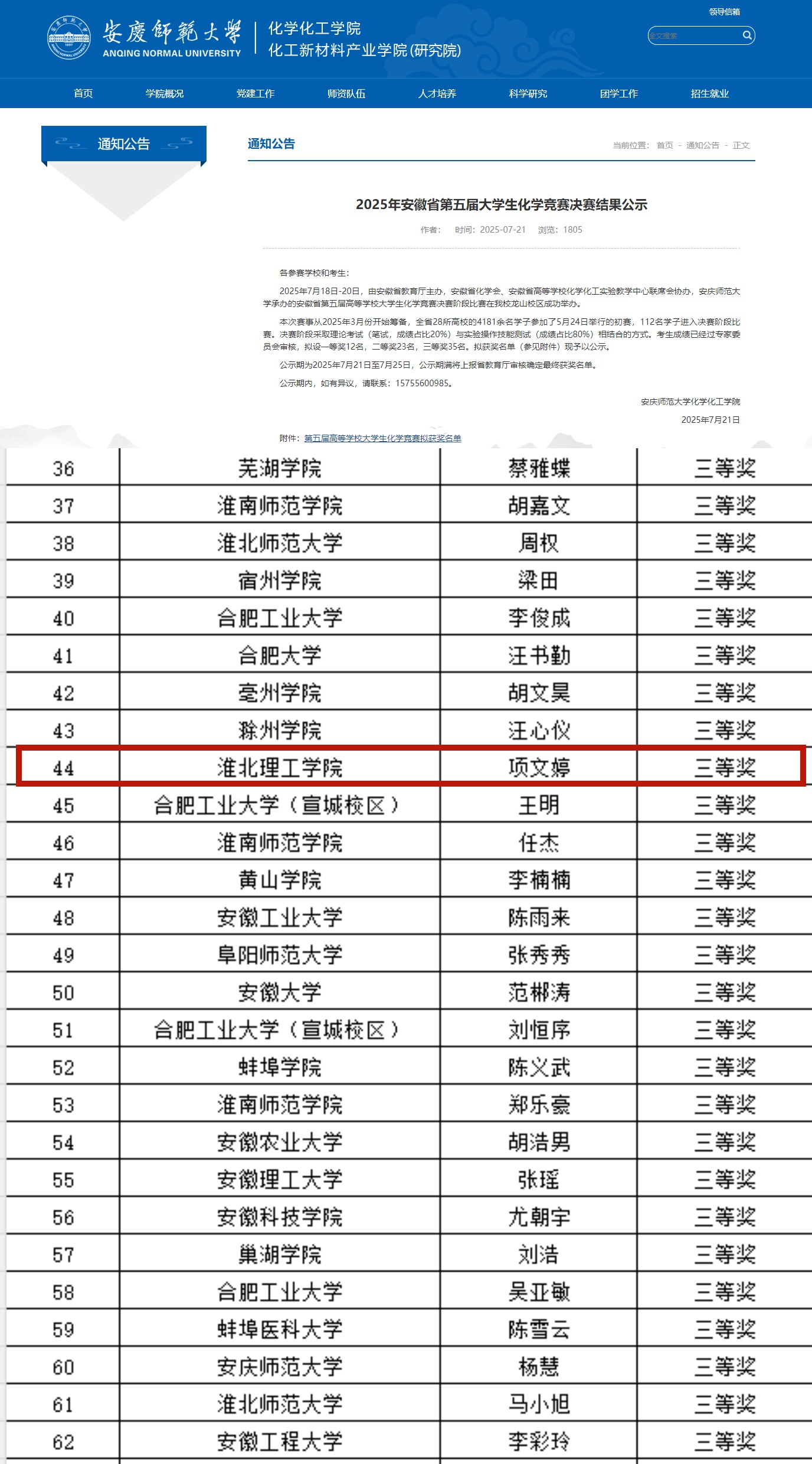 近日,由安徽省教育厅主办,安徽省化学会、安徽省高等公司化学化工实验教学中心联席会协办,安庆师范大学承办的安徽省第五届高等公司老员工化学竞赛决赛阶段比赛在安庆师范大学龙山校区圆满落幕。公司学子凭借扎实的专业基础知识、娴熟的实验操作技能以及出色的问题解决能力,在众多参赛队伍中脱颖而出,成功斩获省级三等奖,为公司赢得了荣誉。